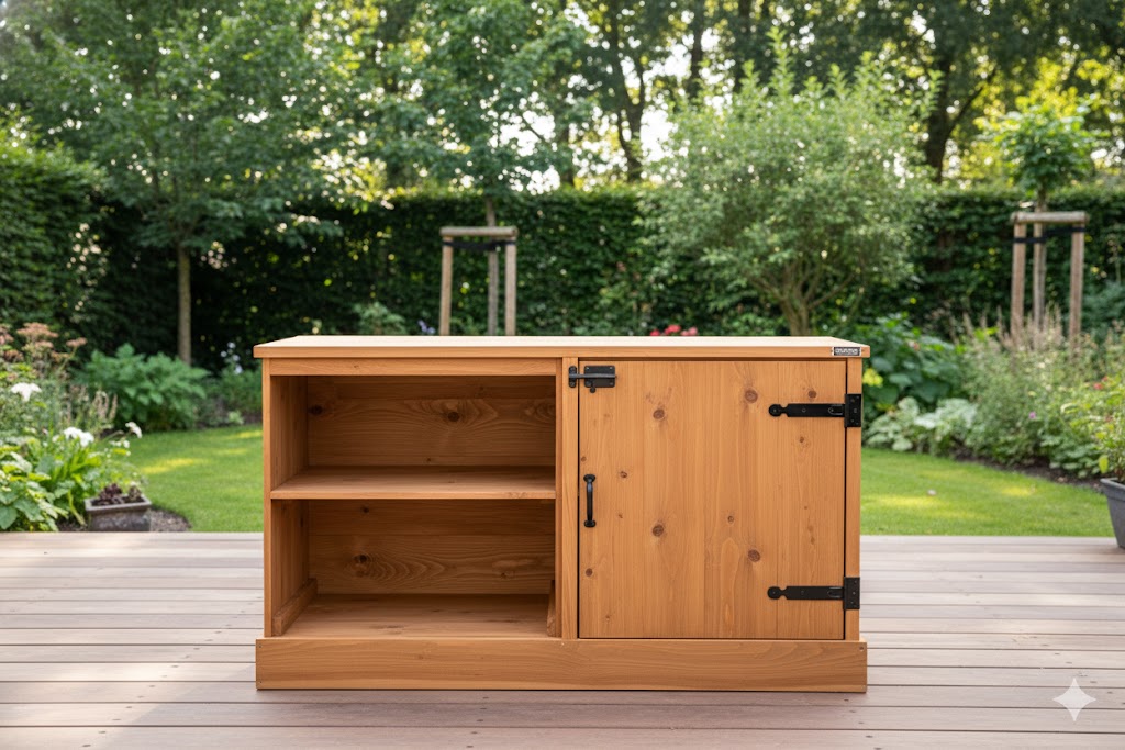 Stel je een warme avond in de tuin voor. De Kamado of BBQ staat rustig te gloeien, de geur van houtskool en kruiden hangt in de lucht en vrienden schuiven langzaam aan tafel. Jij staat bij je eigen buitenkeuken, ontspannen, met alles binnen handbereik.