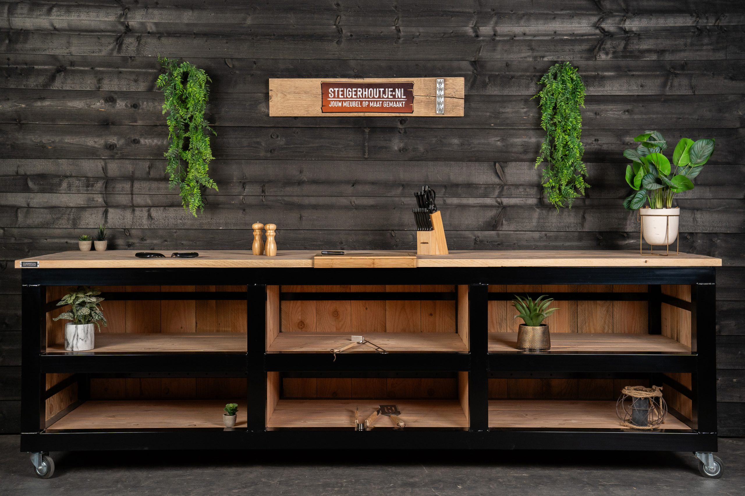 Buitenkeuken Staalo is een oerdegelijk model. Het is opgebouwd uit een stalen frame (koker 8x8cm) met een zwarte poedercoating. De keuken bestaat uit douglas planken, wat het een robuuste uitstraling geeft. Verder is de keuken gemakkelijk te verplaatsen door de stevige zwenkwielen en kan het aangepast worden op elke maat BBQ.