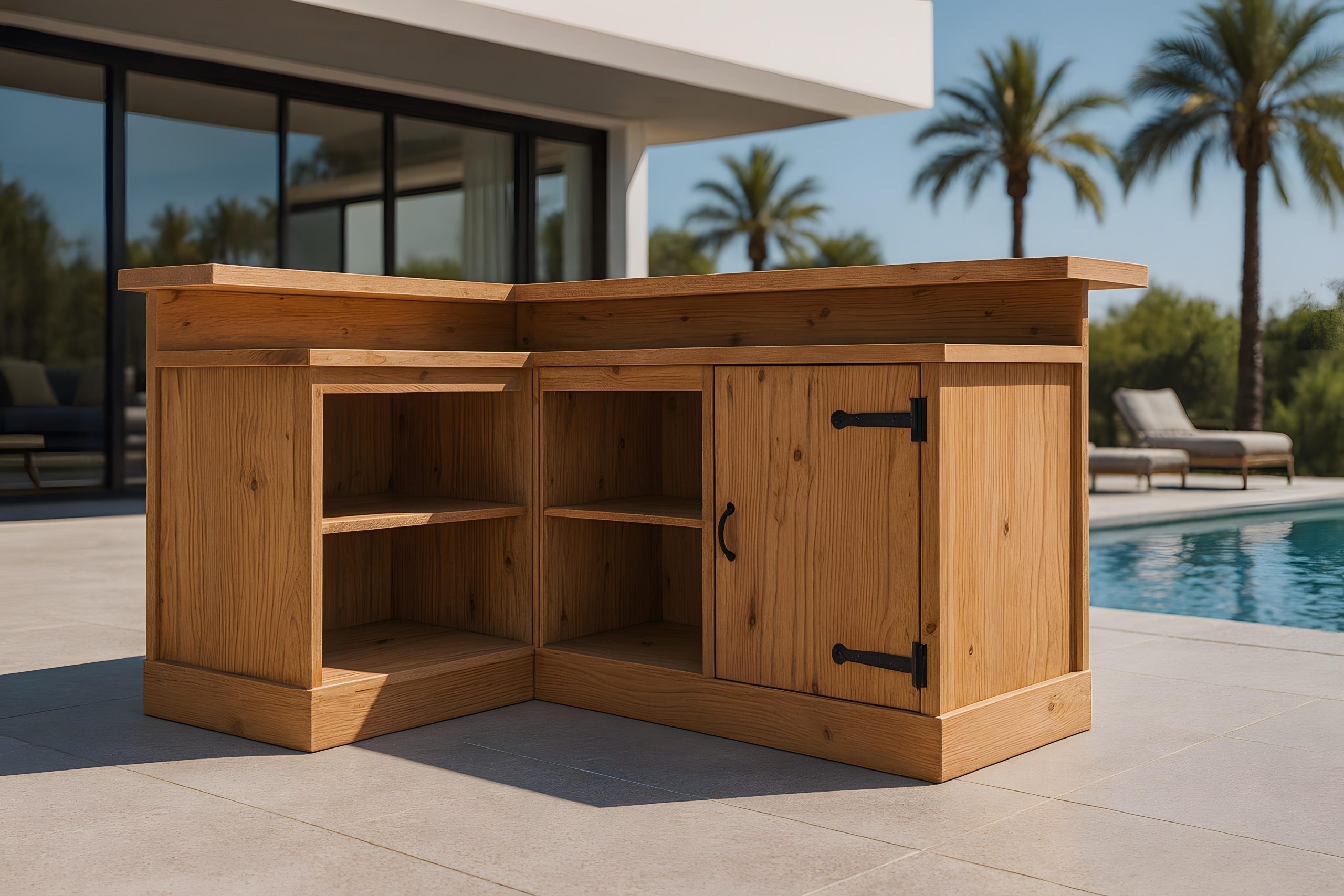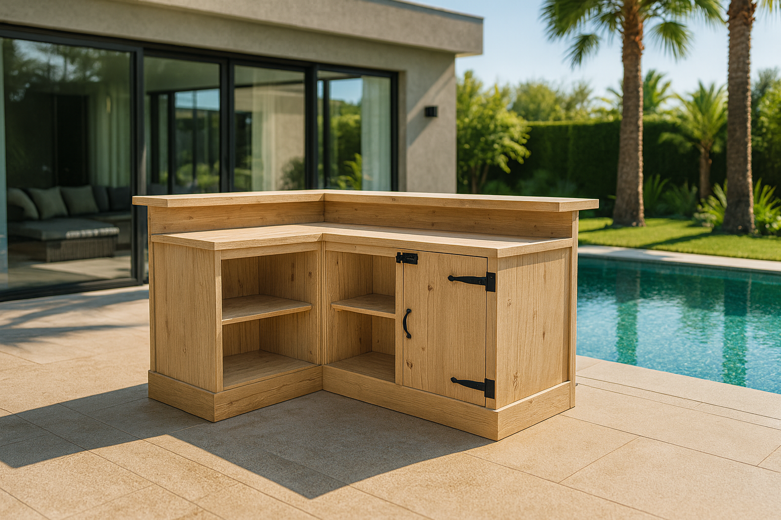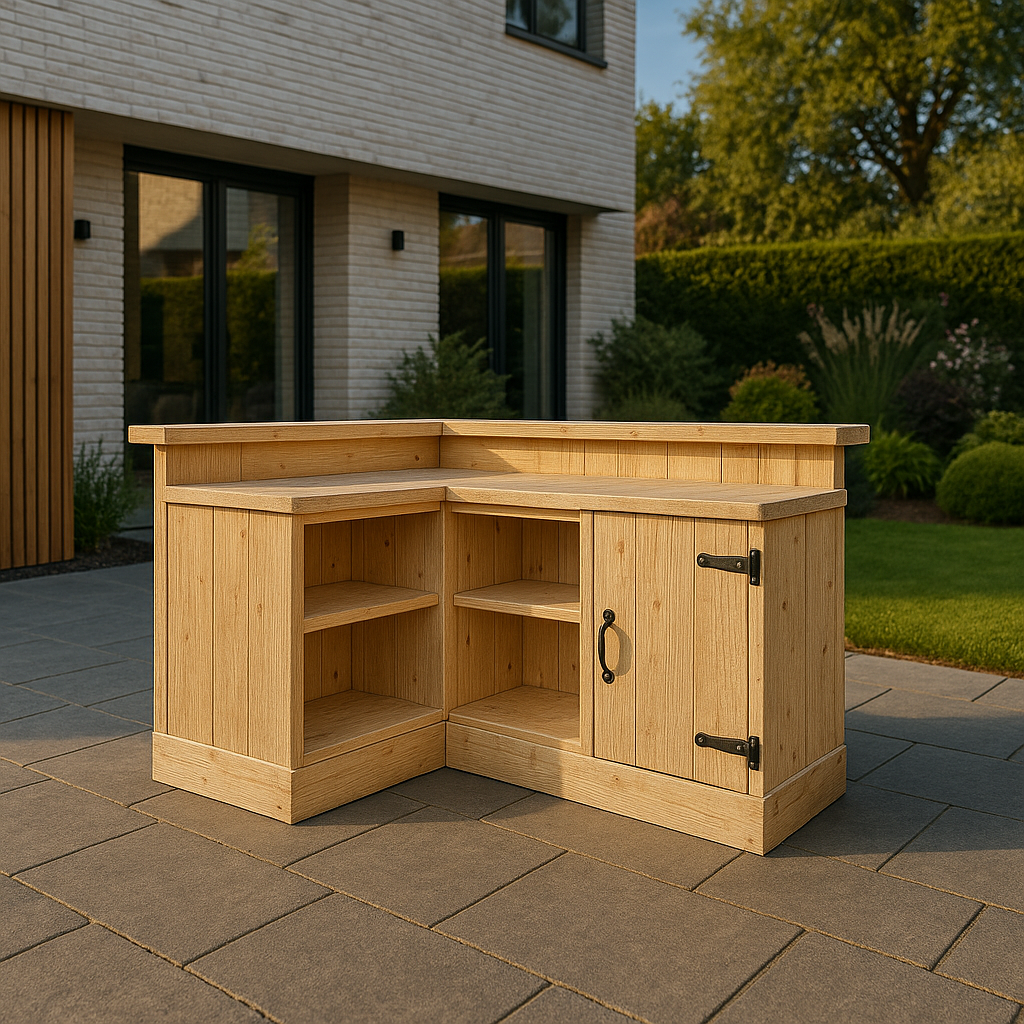 De uiteindelijke houtbehandeling en afwerking kies je zelf. Zo kun je de bar precies laten aansluiten bij jouw tuin en stijl.